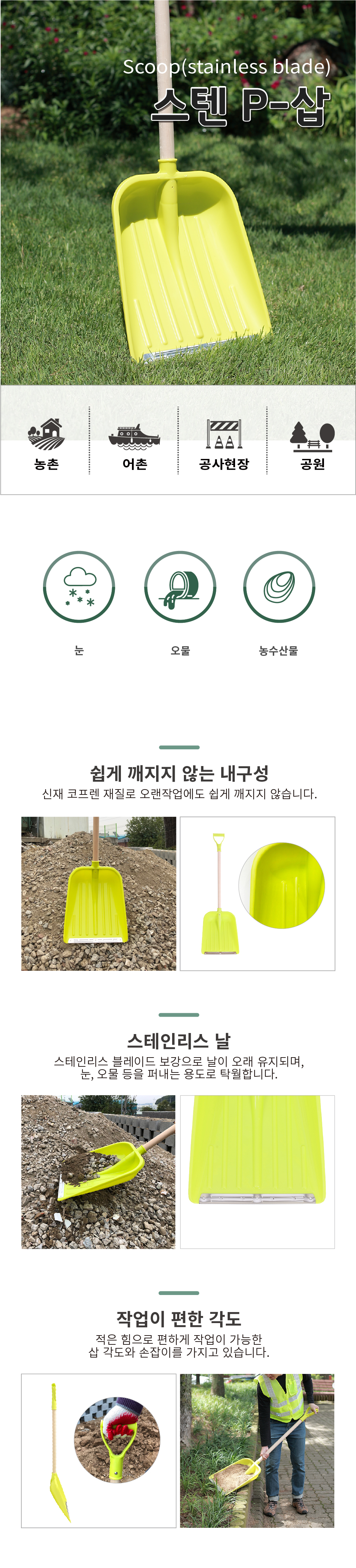 - 눈이 샇여 청소할 때도 스테인레스 날이 있어 오래 사용이 가능