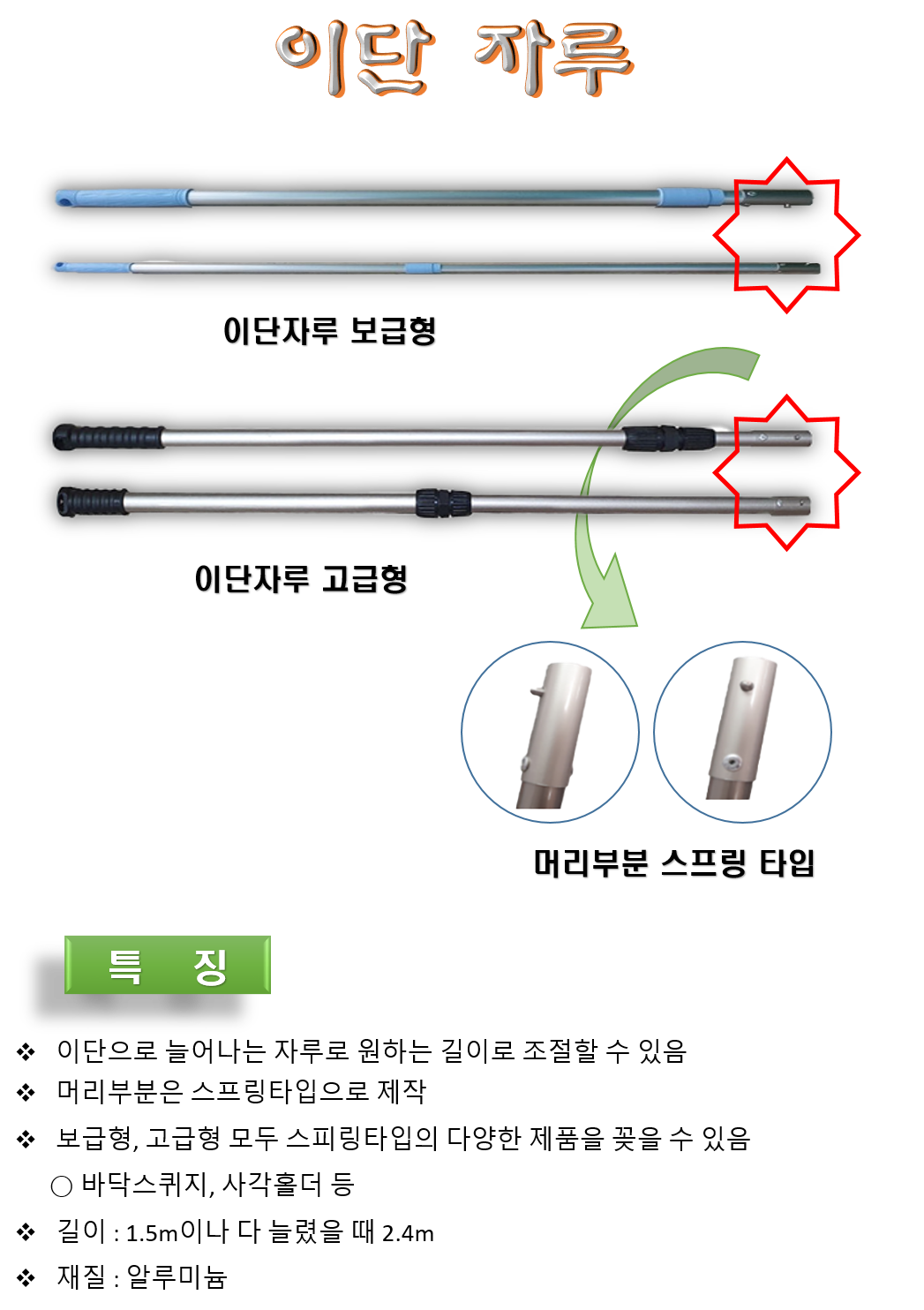 청소도구 폴대 다목적폴대 스퀴지폴대 라이노 이단자루 1.5~2.4m