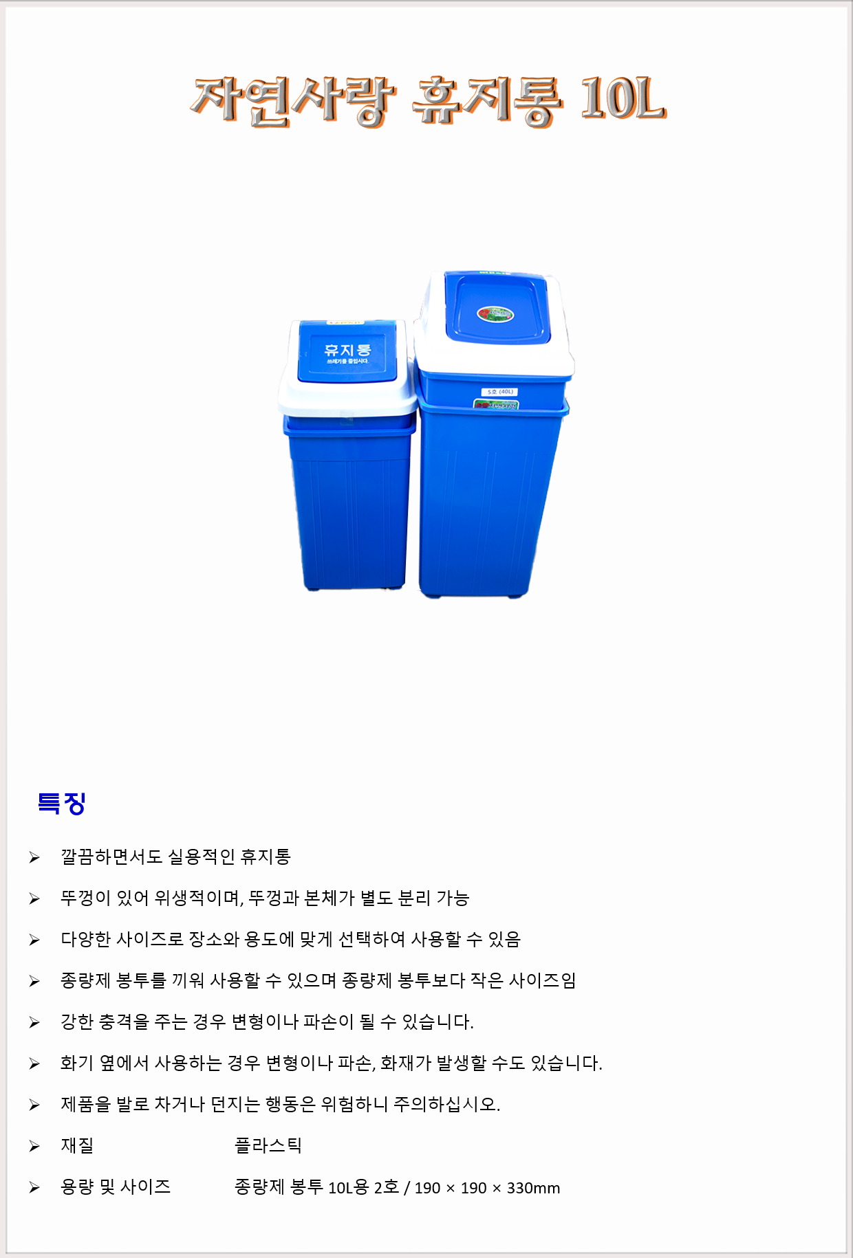 청소도구 쓰레기통 플라스틱 휴지통 미진 자연사랑 휴지통 10L