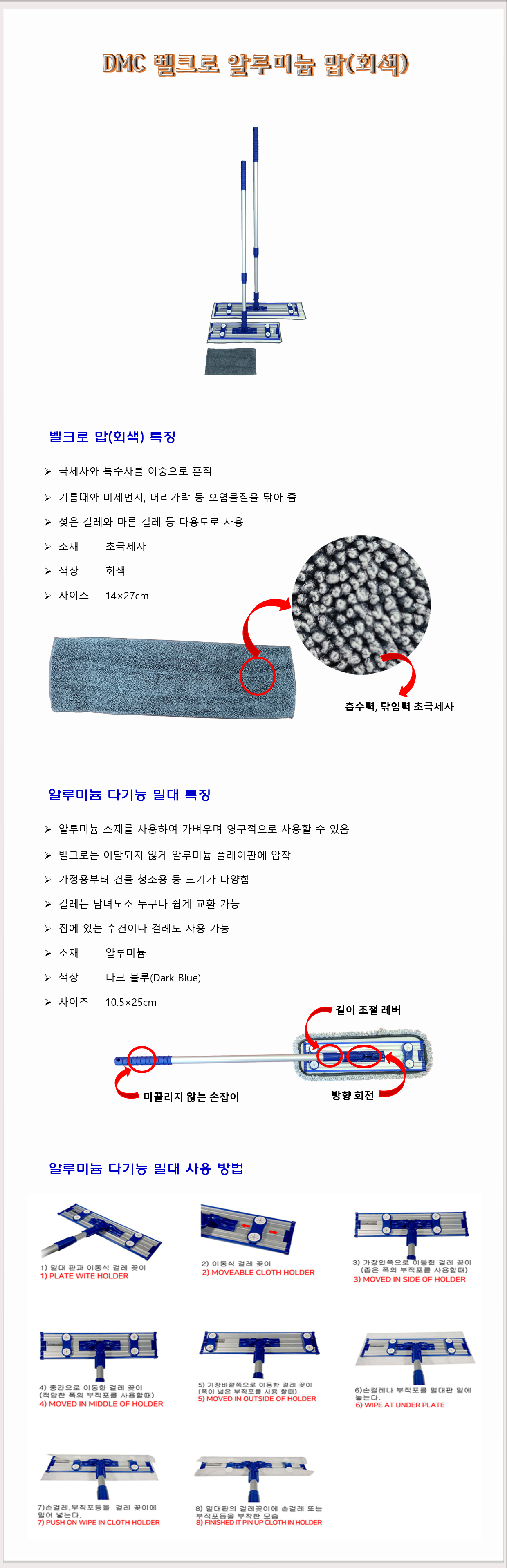 청소도구 작업도구 걸레 밀대 바닥밀대 DMC 벨크로 알루미늄 맙(회색) 27cm