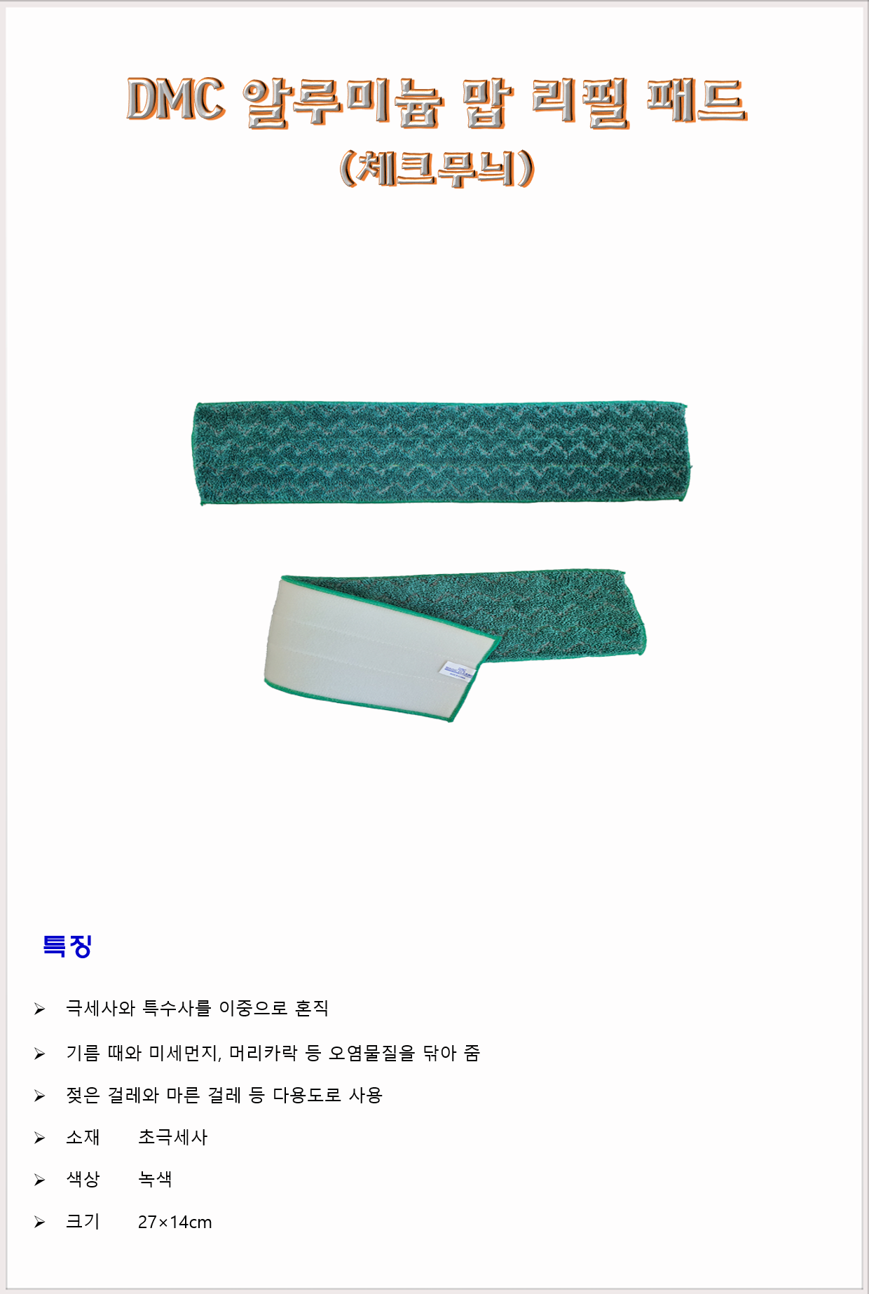 청소도구 작업도구 걸레 밀대 바닥밀대 DMC 알루미늄 맙 리필 패드(체크무늬) 27cm