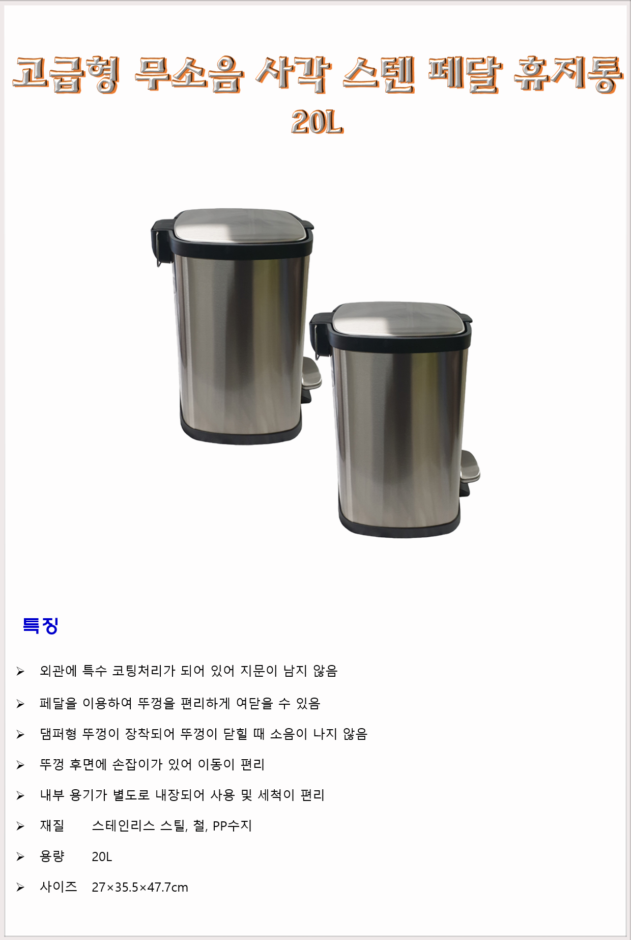 청소도구 쓰레기통 고급형 무소음 사각 스텐 페달 휴지통 20L