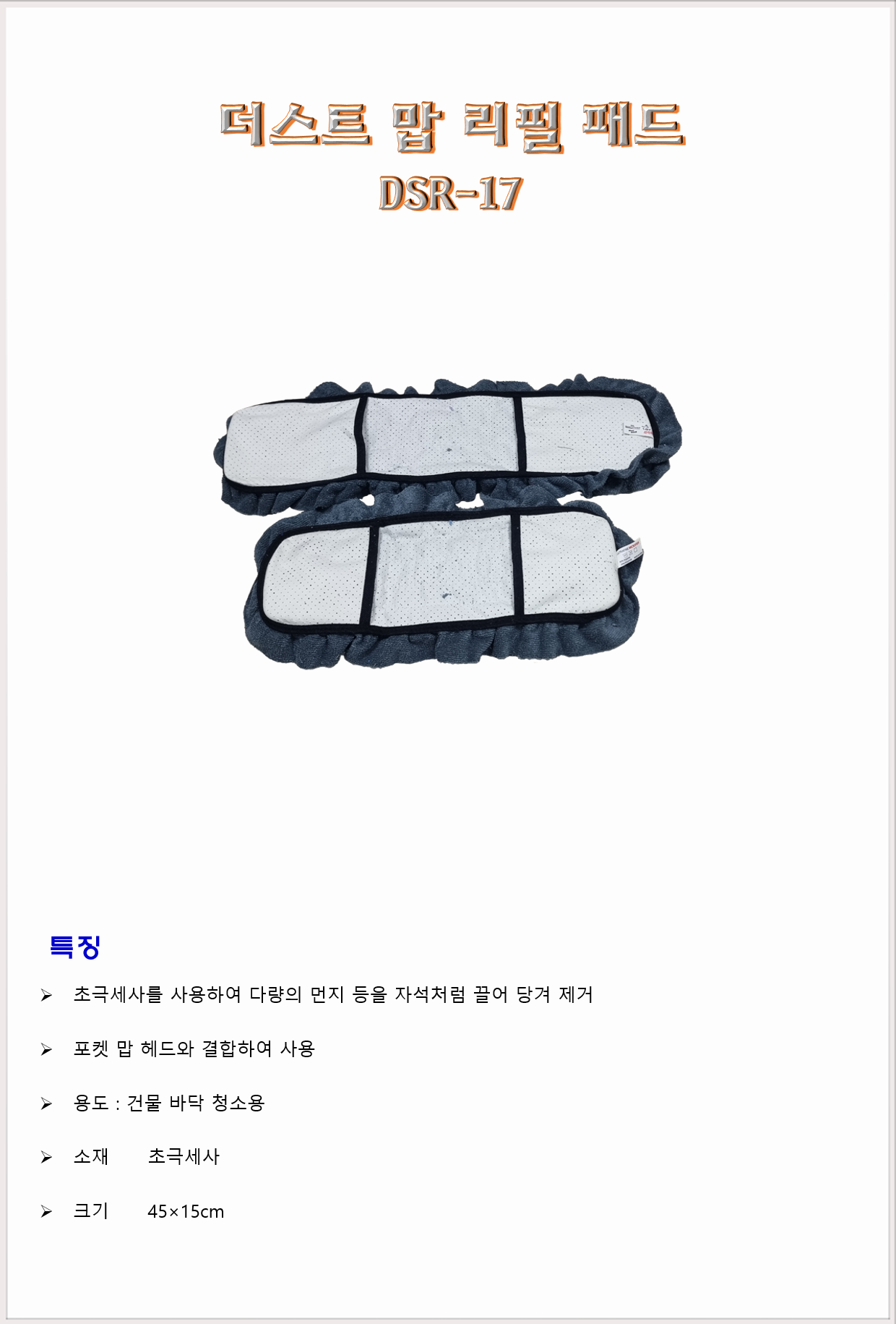 청소도구 작업도구 걸레 밀대 바닥밀대 DMC 더스트맙 리필 패드 DSR-17 45cm