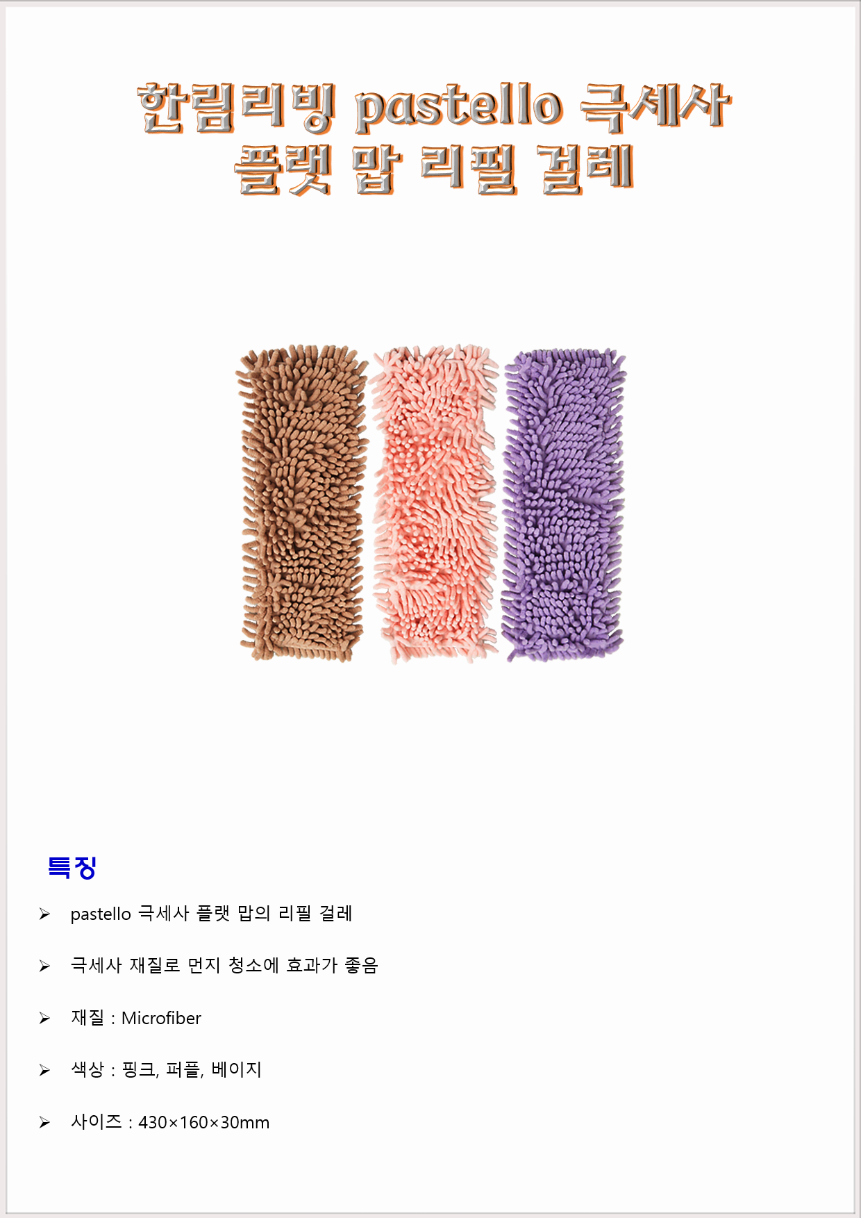 청소도구 밀대 바닥밀대 한림리빙 pastello 극세사 플랫 맙 리필 걸레(43cm)