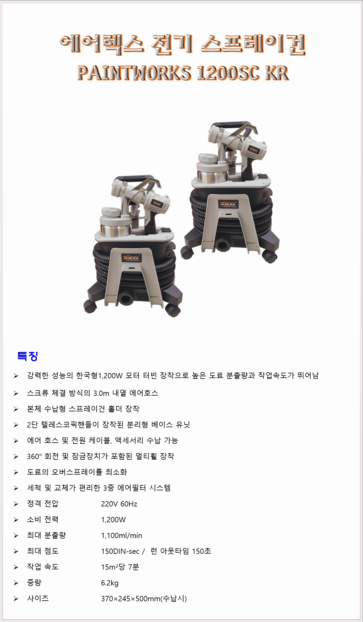 공구 페인트 도구 에어렉스 전기 스프레이건 PAINTWORKS 1200SC KR