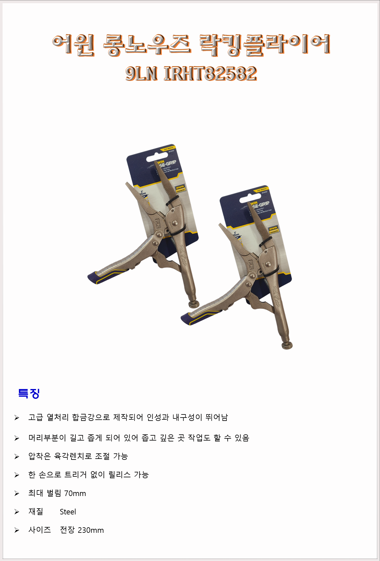 공구 수공구 어윈 롱노우즈 락킹 플라이어 9LN IRHT82582 230mm