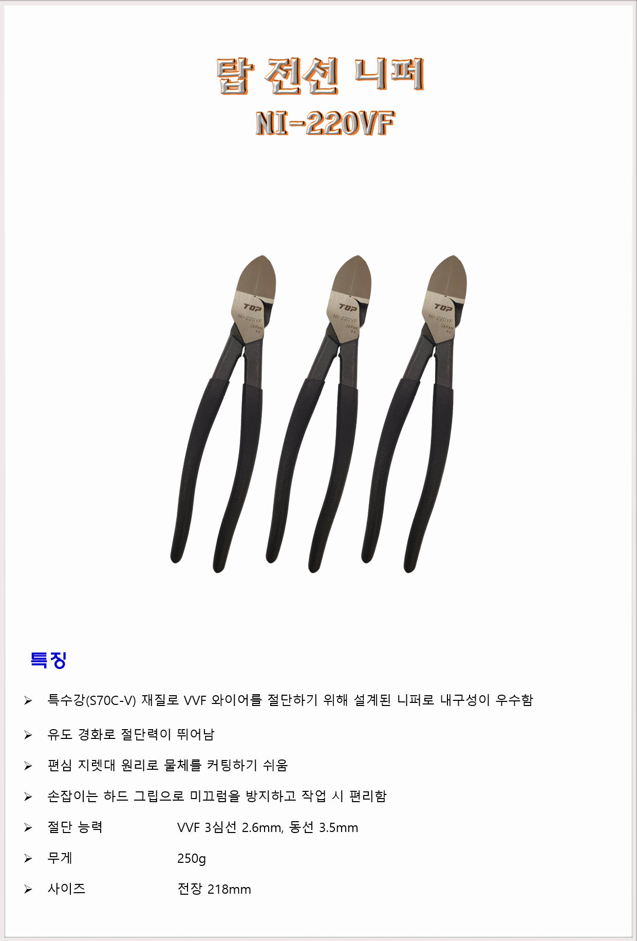 공구 수공구 탑 전선 니퍼 NI-220VF 218mm