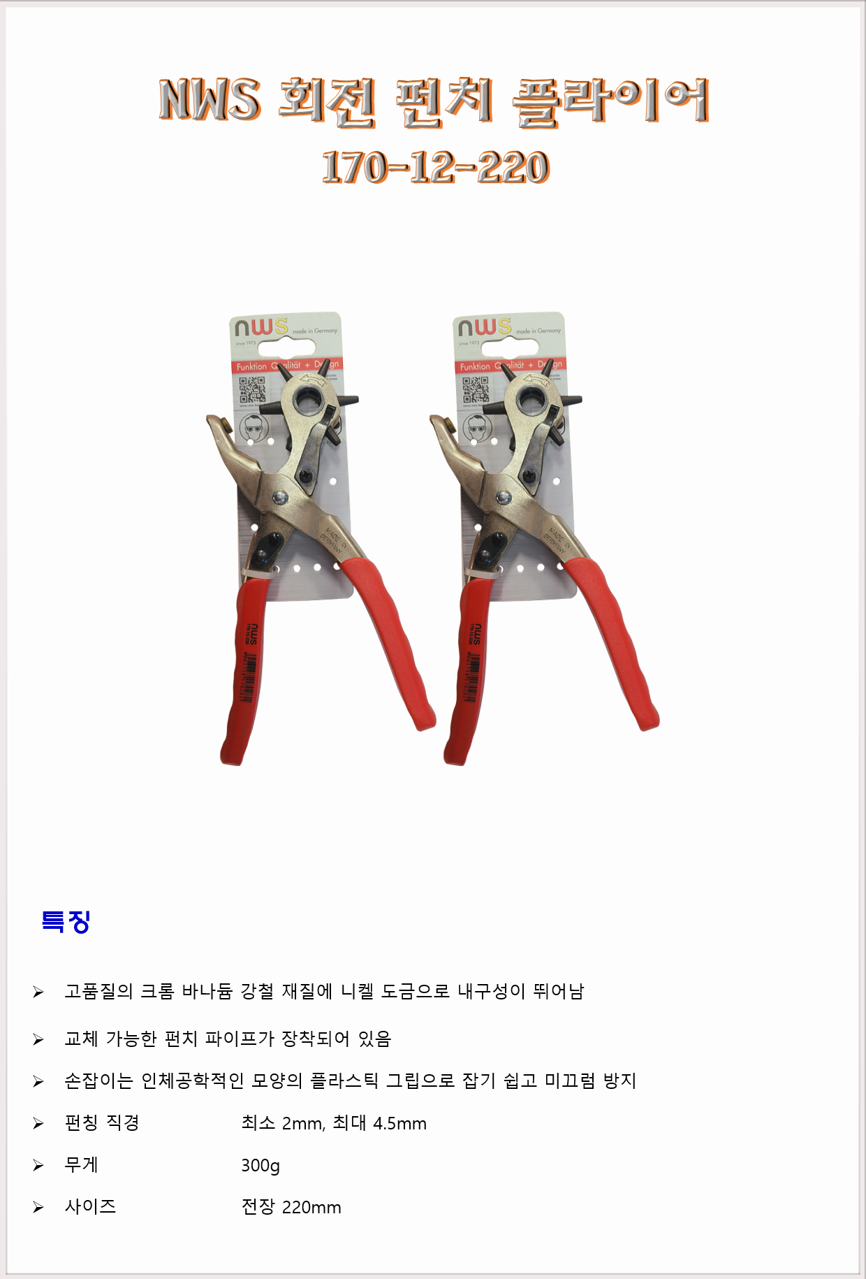 공구 수공구 NWS 회전 펀치 플라이어 170-12-220 220mm