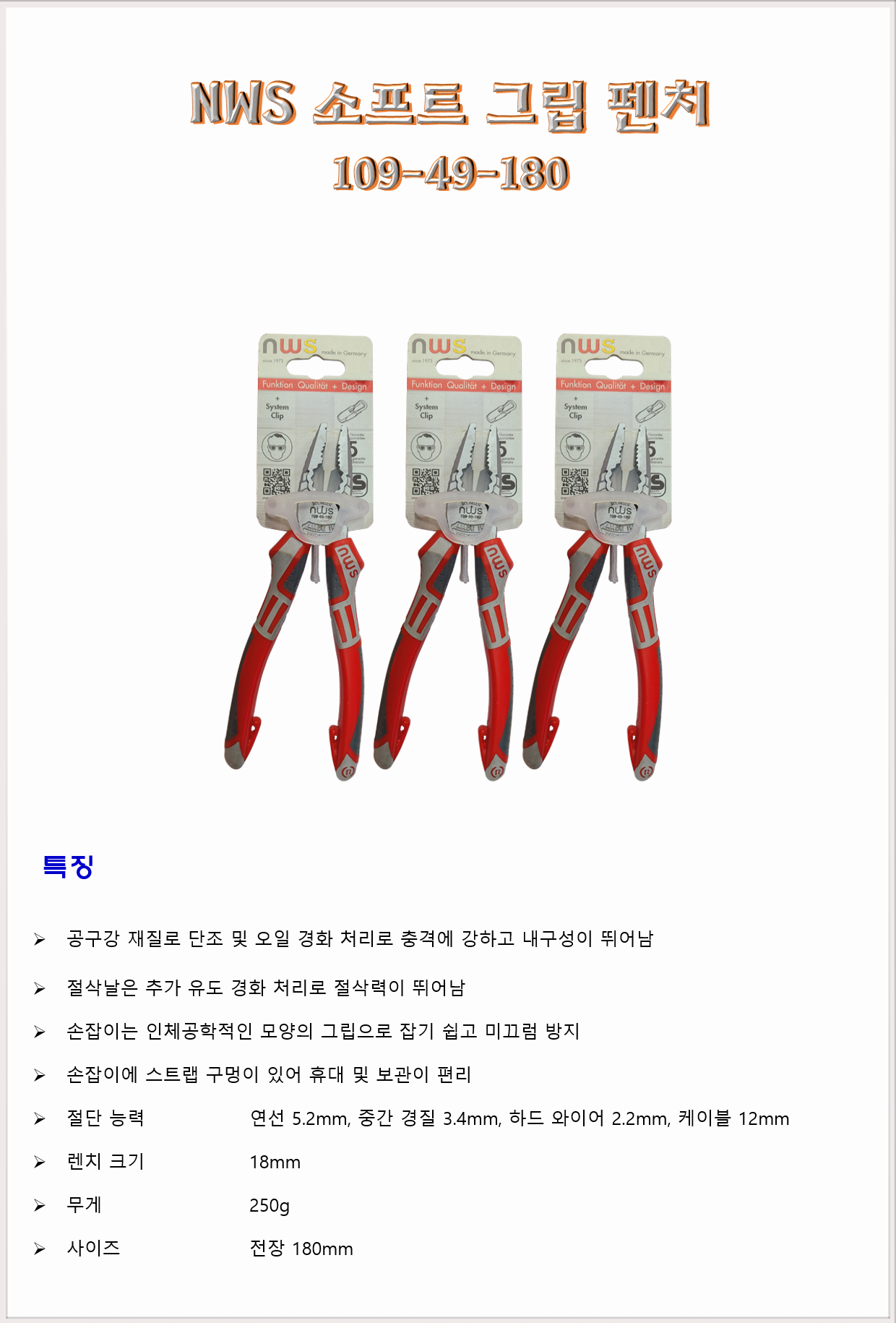 공구 수공구 플라이어 NWS 소프트 그립 펜치 109-49-180 180mm
