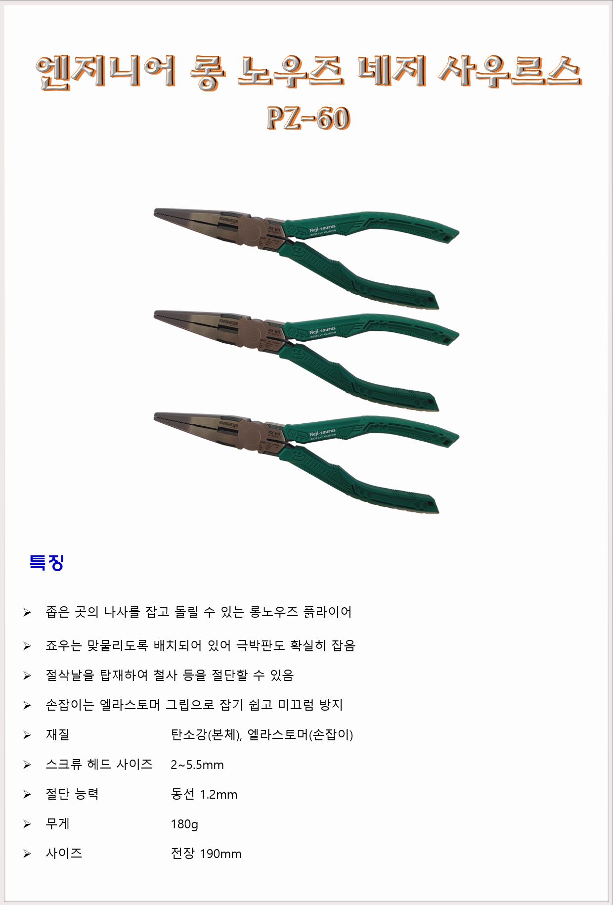 공구 수공구 롱노즈 플라이어 엔지니어 롱 노우즈 네지 사우르스 PZ-60 190mm