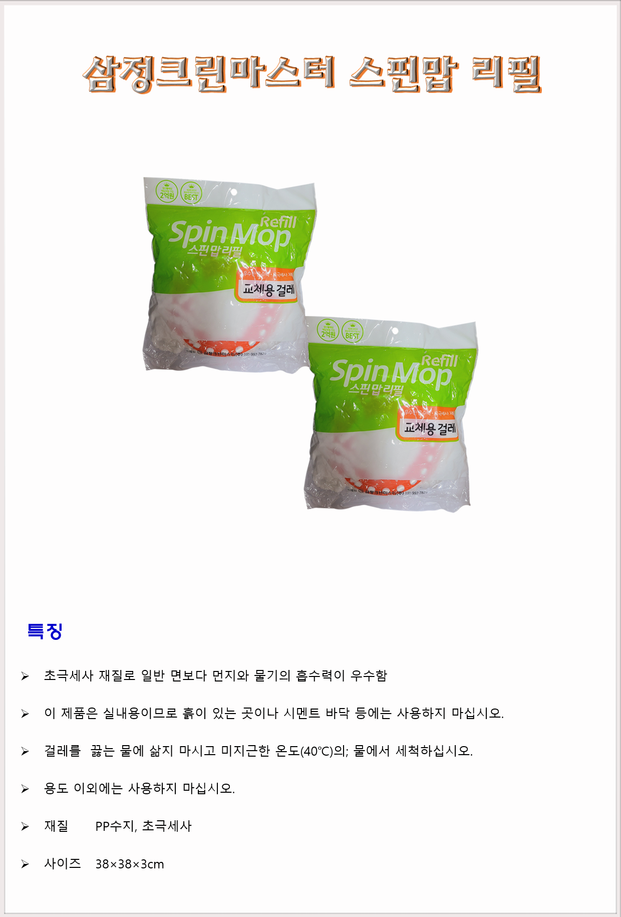 청소도구 통돌이 스핀청소기 삼정크린마스터 스핀맙 리필 38×38×3cm