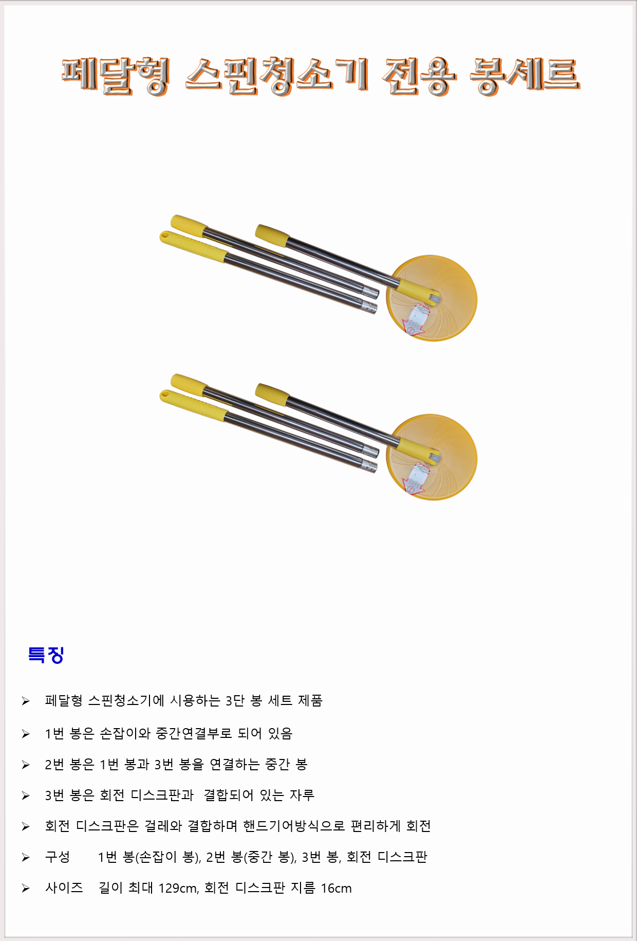 청소도구 통돌이 자루 스핀청소기 자루 페달형 스핀 청소기 전용 봉세트 129()×16cm(원판)