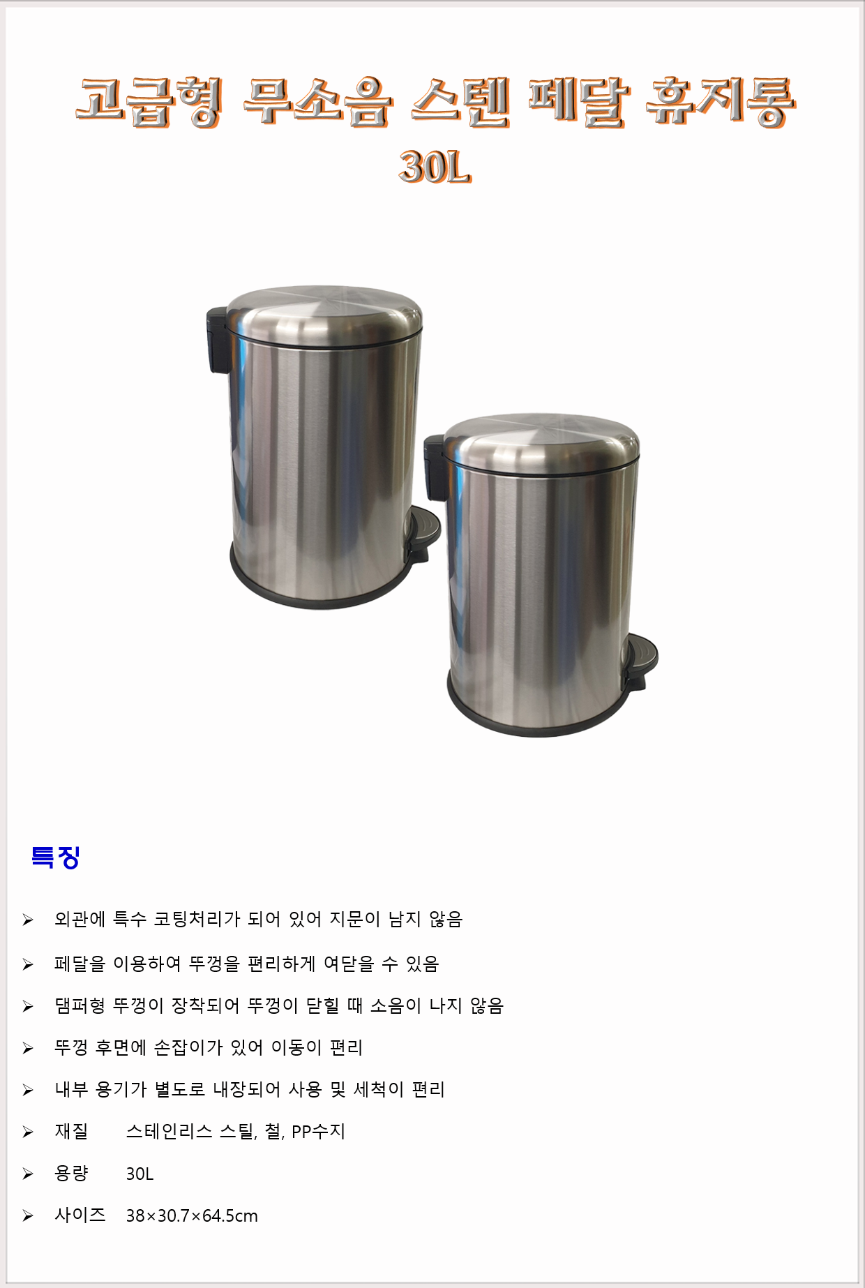 청소도구 쓰레기통 고급형 무소음 스텐 페달 휴지통 30L