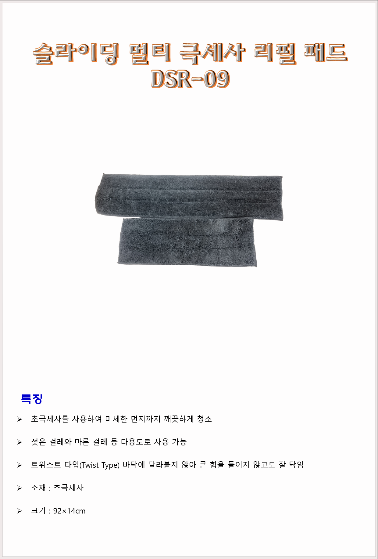 청소도구 작업도구 걸레 밀대 바닥밀대 DMC 슬라이딩 멀티 극세사 리필 패드 DSR-09 92cm